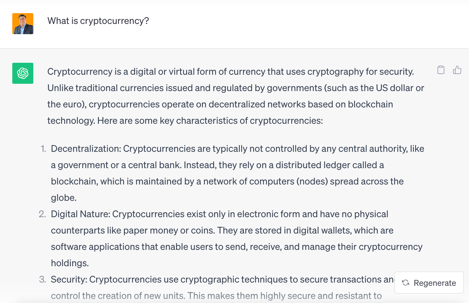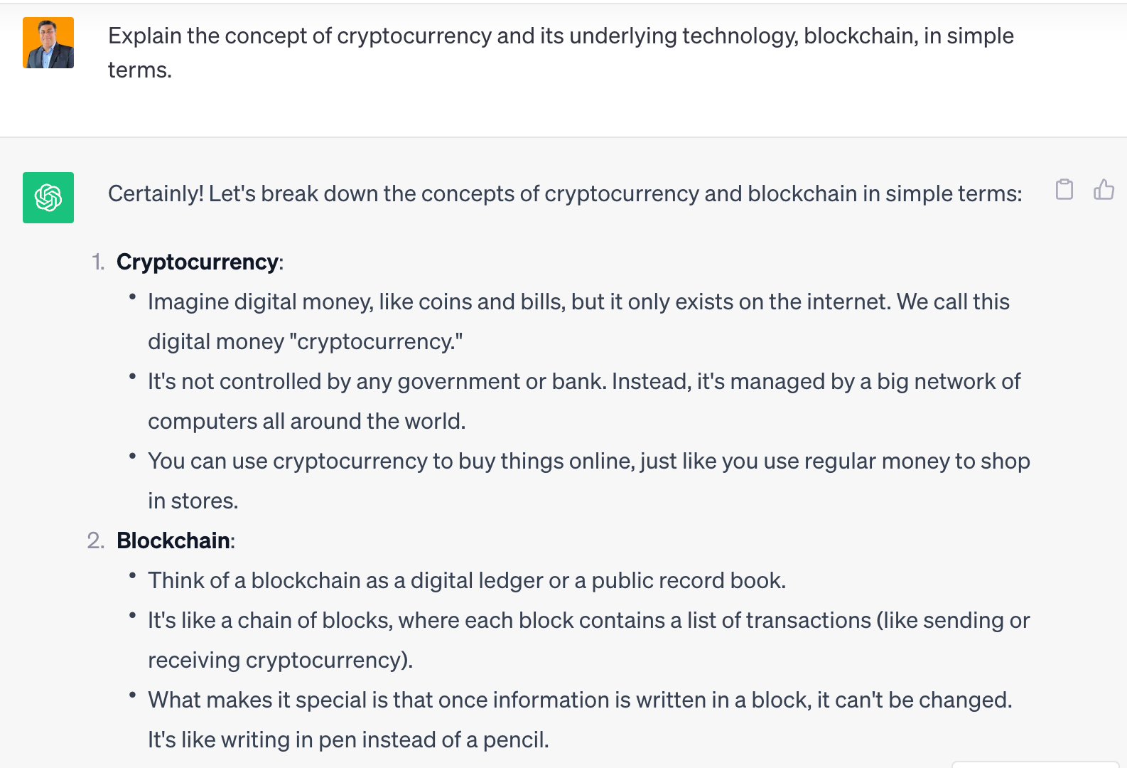 Refinement: “Explain the concept of cryptocurrency and its underlying technology, blockchain, in simple terms.”